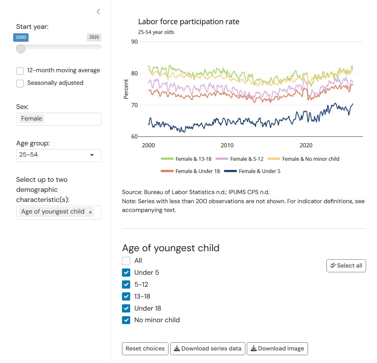 Once selected, the data interactive will show a secondary menu below the chart that allows users to select or unselect which series to display. The screenshot below shows “Age of youngest child” as an example.