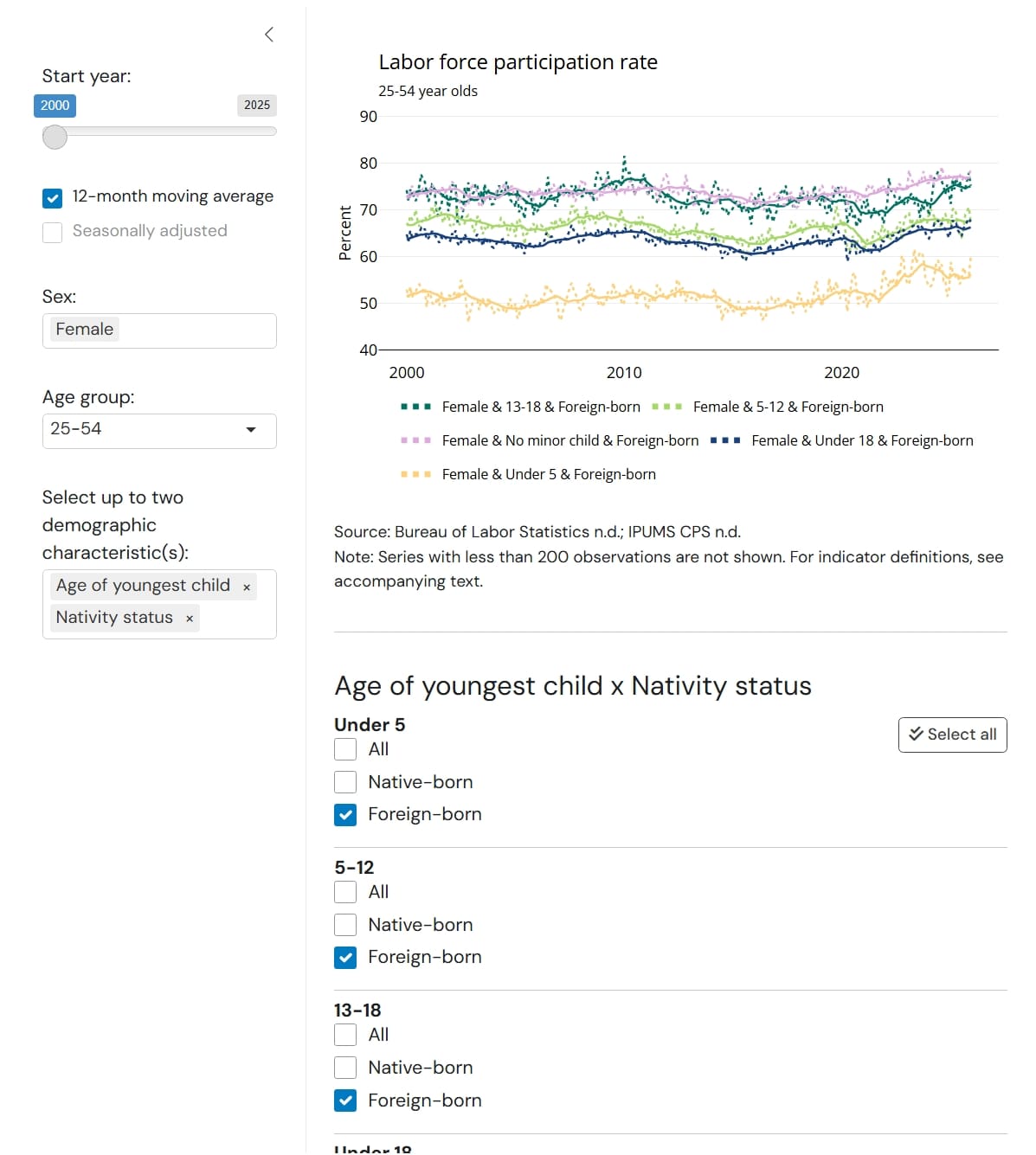 Flipping the order of the same indicators will nest the series of “Age of youngest child” within the levels of “Nativity status.” In addition to the real series (e.g. “Under 5,” “5–12,” etc.), users can select “All” for the second demographic to see aggregates by the first demographic. The screenshot below compares the labor force participation rate of all native-born women and native-born women with a child under 5 years old to their foreign-born counterparts.