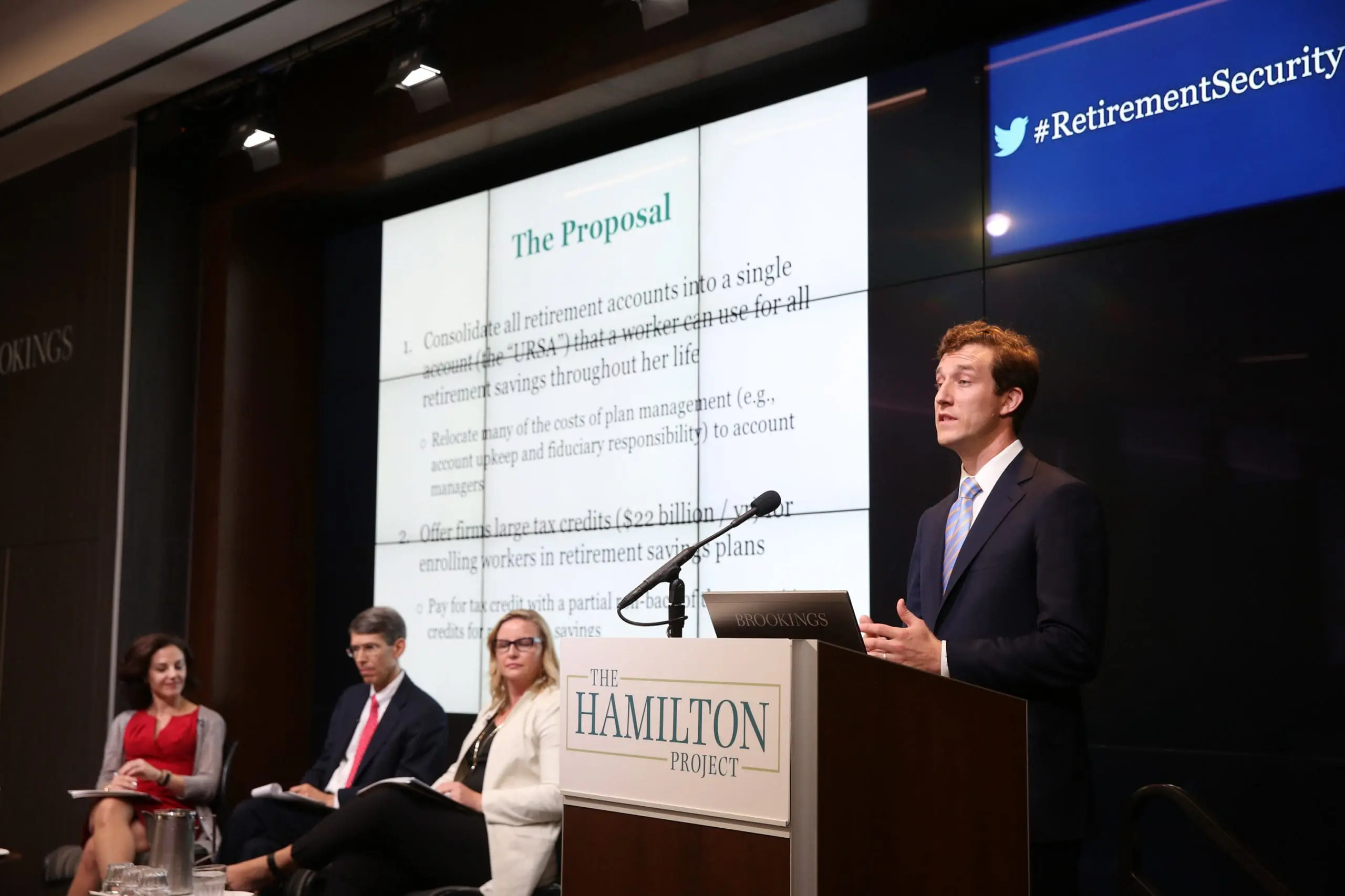 The second panel discussed a new paper by Professor John Friedman of Brown University, suggesting reforms to the landscape of retirement savings accounts. Friedman was joined by James Poterba, Professor of Economics at MIT and President of the National Bureau of Economic Research, and Debra Whitman, Chief Public Policy Officer at AARP. Melissa S. Kearney, Director of The Hamilton Project, moderated the discussion.