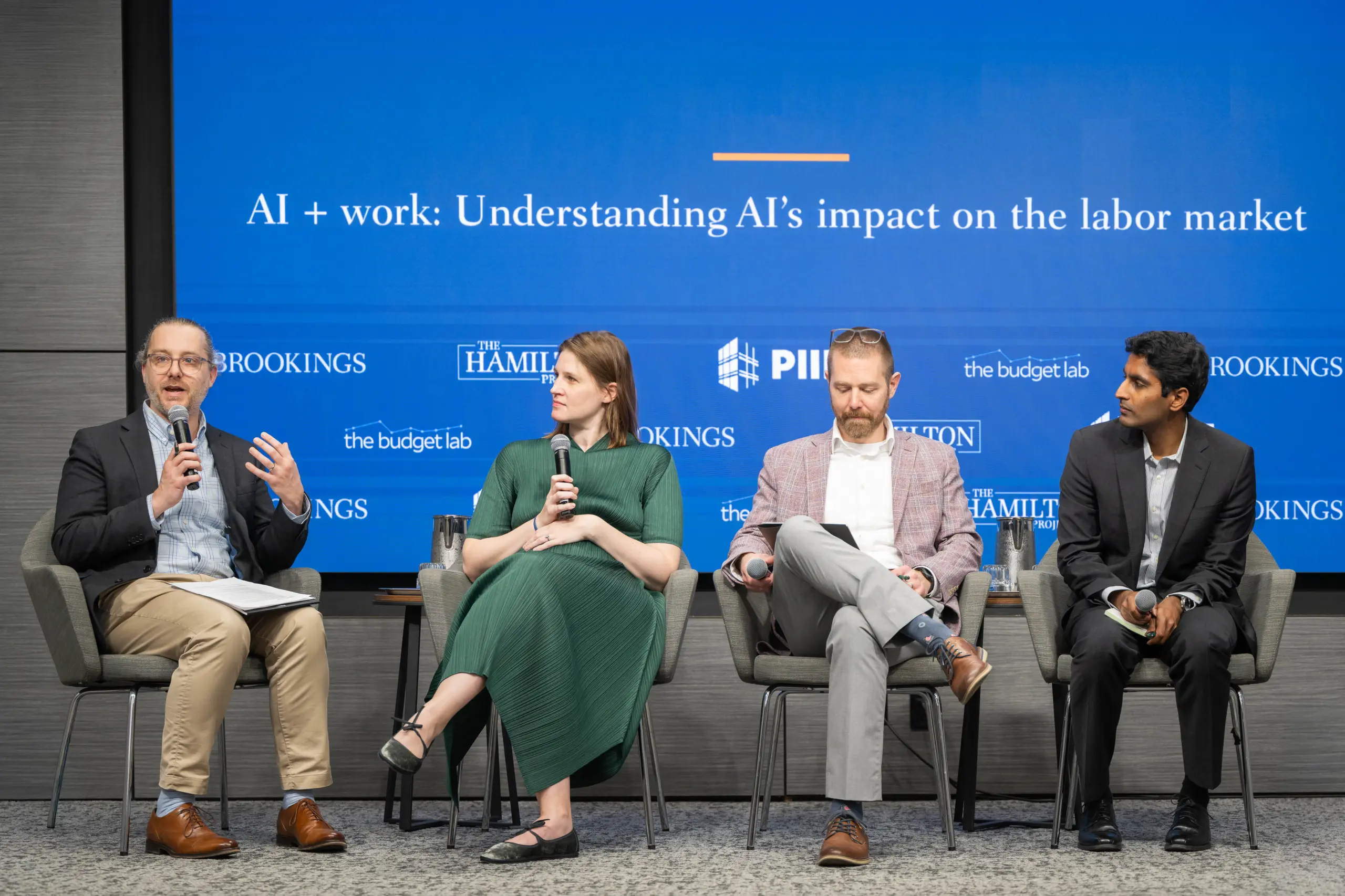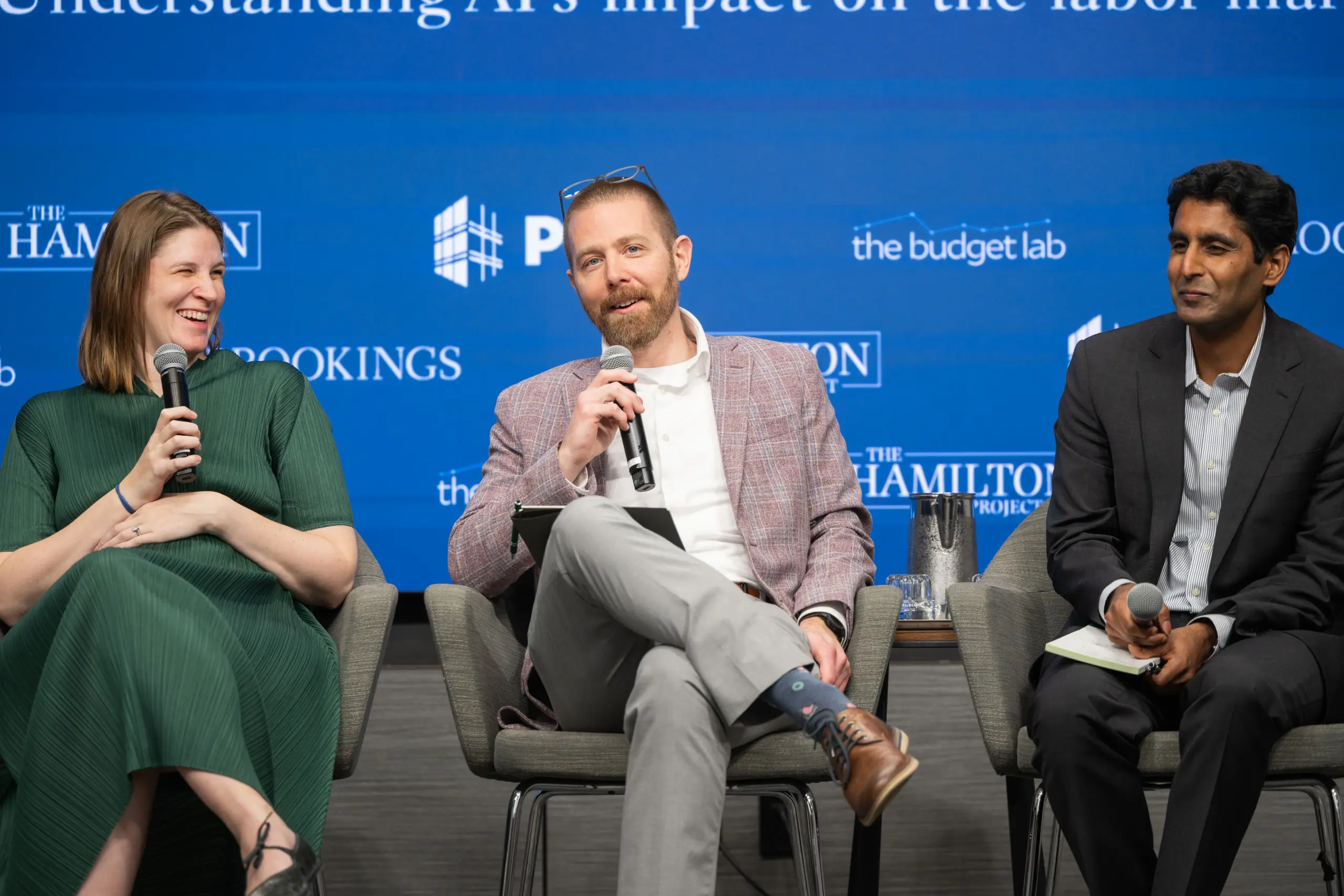The event featured a research presentation by Jed Kolko (Peterson Institute for International Economics) followed by a panel discussion with Bharat Chandar (Stanford Digital Economy Lab and Institute for Human-Centered Artificial Intelligence), Martha Gimbel (Budget Lab at Yale), and Nathan Goldschlag (Economic Innovation Group), moderated by Ben Casselman (The New York Times).