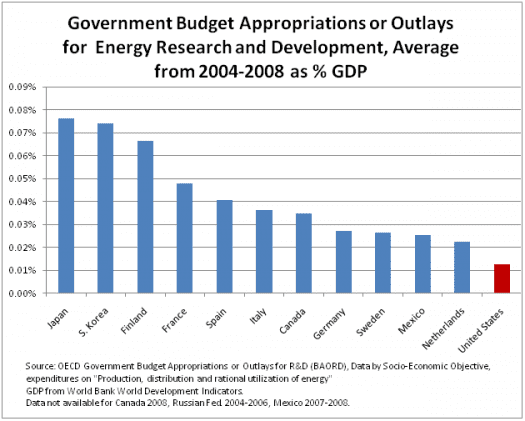It is also instructive to compare U.S. spending with other countries. This comparison is if anything, even less favorable. During the 5 year period of 2004-2008, the average U.S. federal level of support of energy R&D was equal to about 0.0127% or about 1/100 of 1% of GDP according to OECD calculations.23 This rate of investment in energy R&D puts the United States in 12th place out of the 12 OECD countries that spent the most on energy R&D during this period.