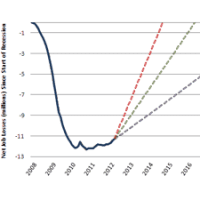The chart below, which incorporates pre-recession assumptions about labor force growth from the Bureau of Labor Statistics, shows how the jobs gap has evolved since the start of the Great Recession in December 2007, and how long it will take to close under different assumptions for job growth. The solid line shows the net number of jobs lost since the Great Recession began. The broken lines track how long it will take to close the jobs gap under alternative assumptions about the rate of job creation going forward.
