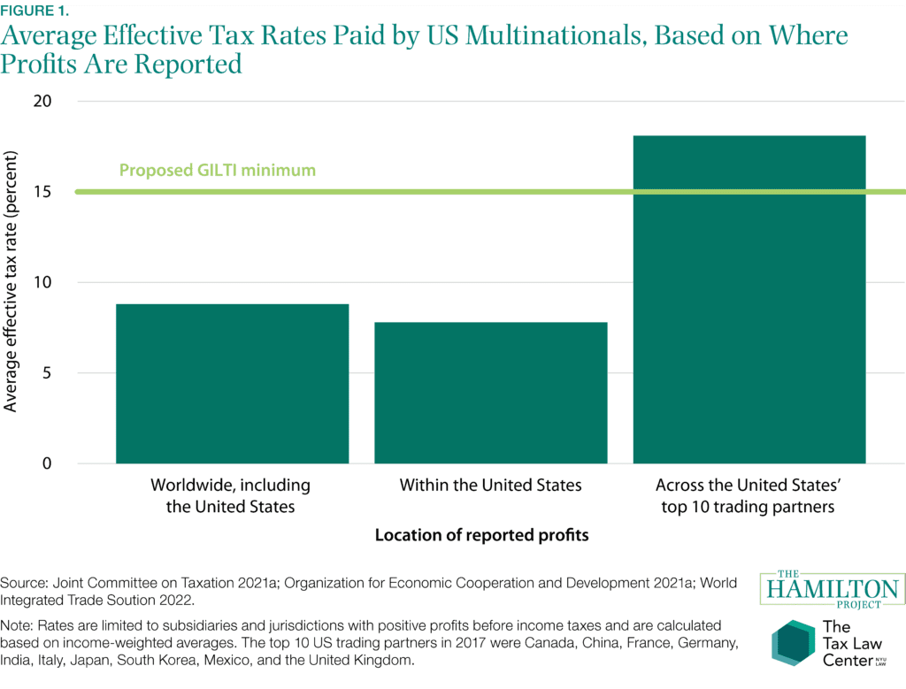 Currently, the statutory tax rate on corporate profits earned in the United States is 21 percent. The foreign profits earned by US multinationals generally do not face that same rate (as they would under a pure worldwide international tax system), but neither are those foreign profits completely exempt from US tax (as they would be under a pure territorial system). Instead, the United States operates under the hybrid international tax system established by the TCJA.3 Specifically, a US multinational is intended to pay a minimum rate of 10.5 percent on most of its foreign profits (set to increase to about 13 percent after 2025). This minimum tax provision is known as GILTI (global intangible low-taxed income; see Congressional Research Service [CRS] 2021a).