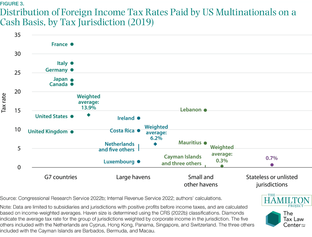 6. Figures 1, 2, and 3 are based on IRS country-by-country data that are described in more detail in JCT (2021a, fn237) and IRS (2019). As JCT notes, because of the ways in which the data are reported to the IRS, there is some potential for double counting of certain income. To address this issue, JCT dropped stateless categories from calculations, which is the approach we follow in Figure 1; we report the stateless category separately in Figure 3. In Figures 1 and 3, following JCT, we limit samples to countries and/or subsidiaries reporting positive profits before income taxes (following JCT’s calculation of those Figures), but tax jurisdictions reporting negative profits are included in Figure 2. See Clausing (2020b, 931) for discussion of the conceptual differences between including or excluding losses; the magnitude of the impact is relatively small. We report cash tax measures, which reflect taxes paid in a year; taxes paid tend to be somewhat lower than taxes accrued with respect to one year’s profits but are paid over time. (Reporting taxes accrued means reporting taxes that might in fact not ever be paid in some cases, and that might not reflect the time value of deferral, in others.) See JCT (2021a) for figures reported on both cash and accrual basis. For discussion of the BEA data reported in Figure 2 (in which there is no double counting), see Clausing (2020c). For further discussion of cash/accrual and loss issues, see Driessen (2021).