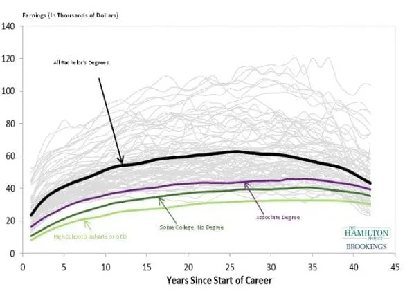 Strikingly, the earnings profile for every major lies above the profile for high school graduates over the first 40 career years. Even in the lowest-earning major, early childhood education, the median bachelor’s graduate earns more at every point during the career than does the median high school graduate. Across the vast majority of majors—though not all—bachelor’s graduates will usually earn more throughout their careers than workers with only an associate degree.
