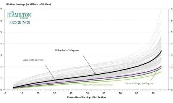 - For the median bachelor’s graduate, cumulative lifetime earnings across majors range from just under $800,000 to just over $2 million.