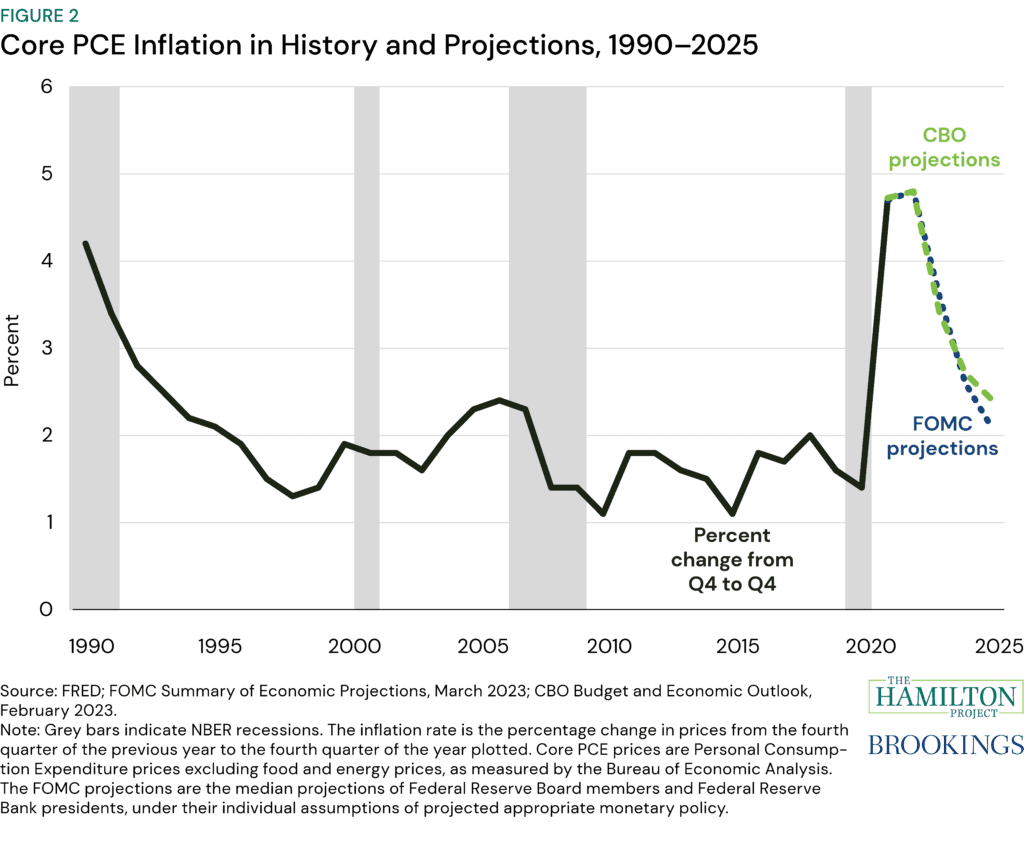Previous analysis from The Hamilton Project suggests that a slowdown in job openings to a more stable rate would mean a temporary return to labor market conditions last seen around late 2014 and early 2015, when the unemployment rate was roughly 5½ percent. Similarly, in both the FOMC and CBO projections, the increase in the unemployment rate required to contain inflation is quite modest and the period in which the unemployment rate exceeds the noncyclical rate is short-lived. That outcome is made more likely by the relative stability in long-term inflation expectations, meaning that the Fed will not need to weaken the economy significantly in order to bring expectations back down.