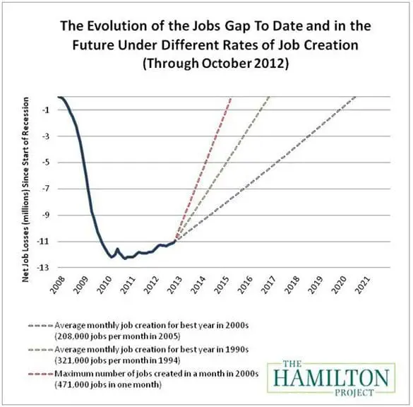 If the economy adds about 208,000 jobs per month, which was the average monthly rate for the best year of job creation in the 2000s, then it will take until April 2020 to close the jobs gap. Given a more optimistic rate of 321,000 jobs per month, which was the average monthly rate of the best year of job creation in the 1990s, the economy will reach pre-recession employment levels by January 2017.